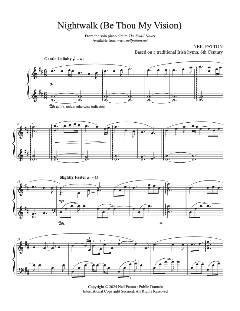 Complete transcription of Nightwalk (Be Thou My Vision) from Neil Patton's The Small Hours album in PDF format.